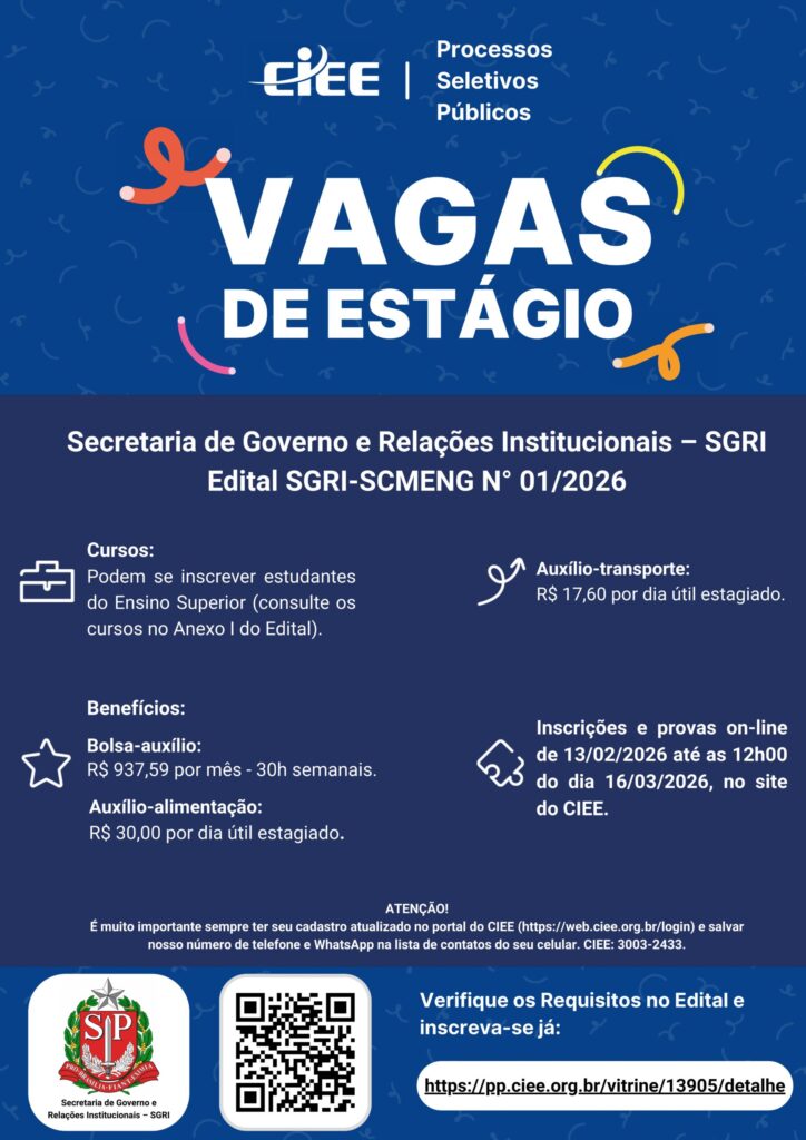 Secretaria de Governo e Relações Institucionais – SGRI Edital SGRI-SCMENG N° 01/2026Oportunidade / Por Fatec Zona Sul EDITAL: SGRI-SCMENG – Edital 01.2026 Compartilhe